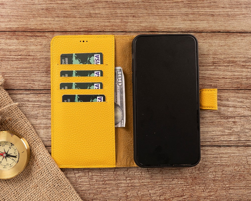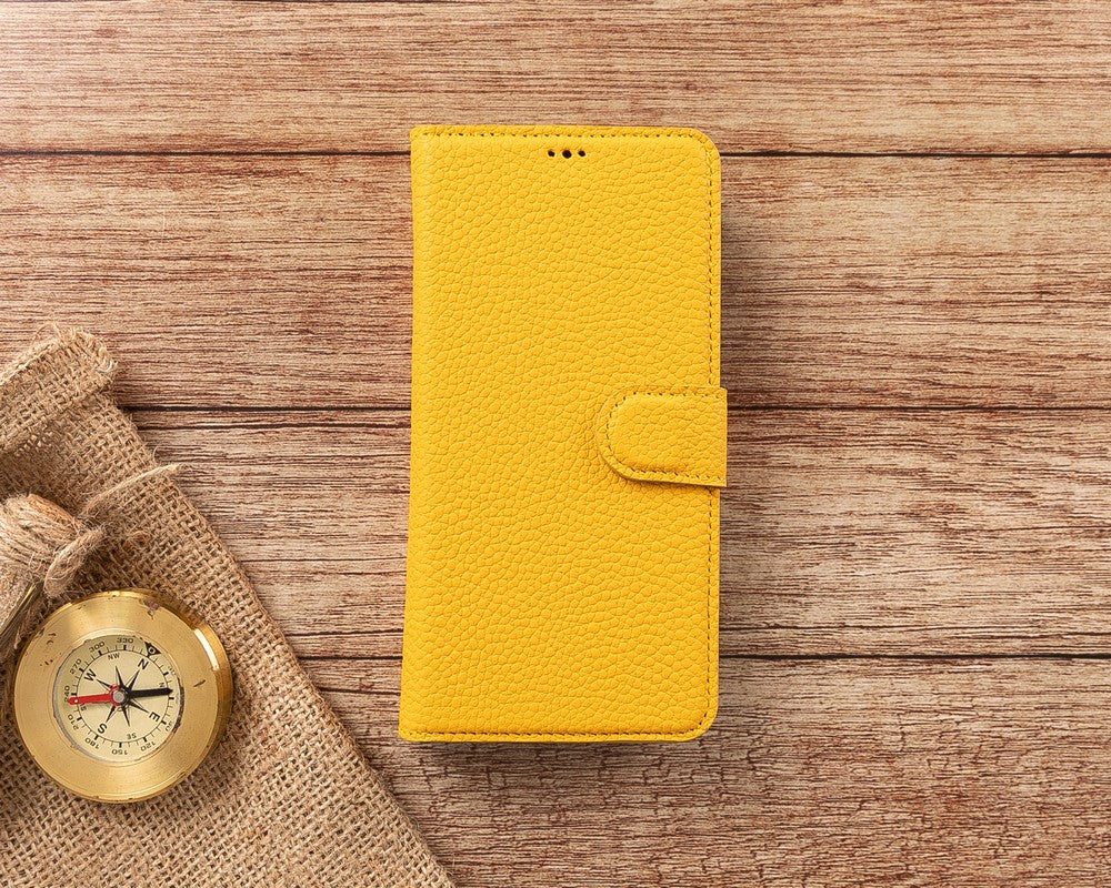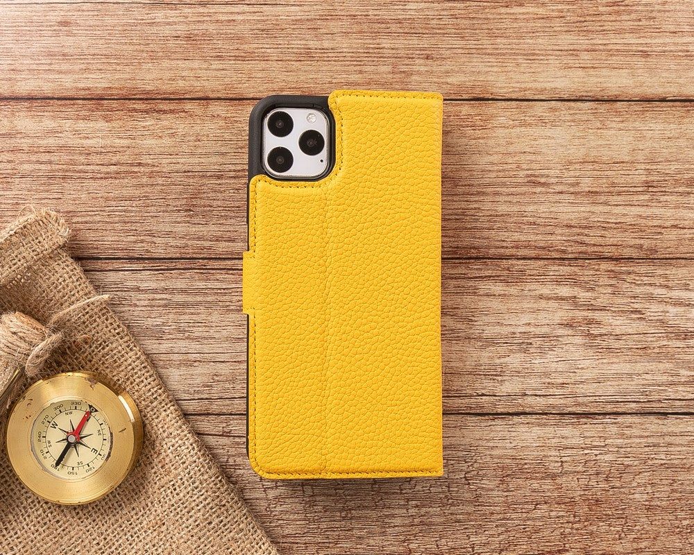 Apple iPhone 11 Pro Max uyumlu, Hakiki Deri, El Yapımı, Cüzdanlı Kılıf, FL12 Sarı