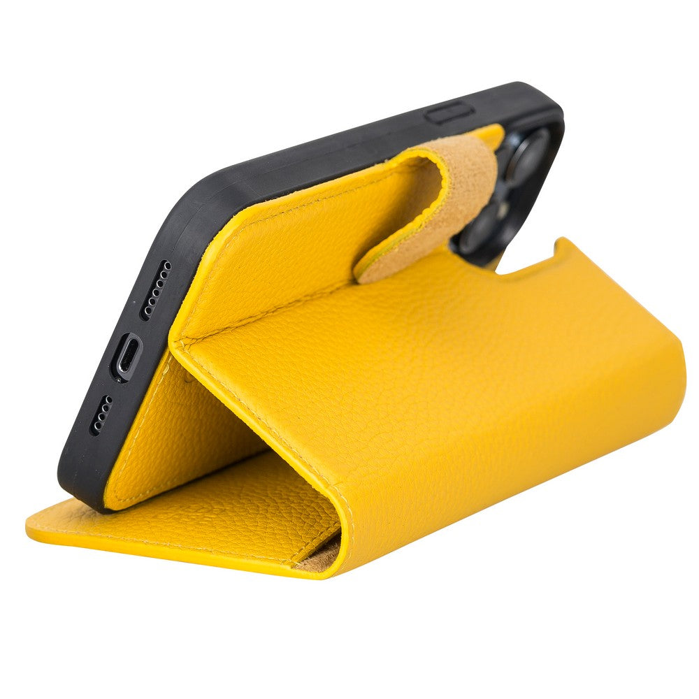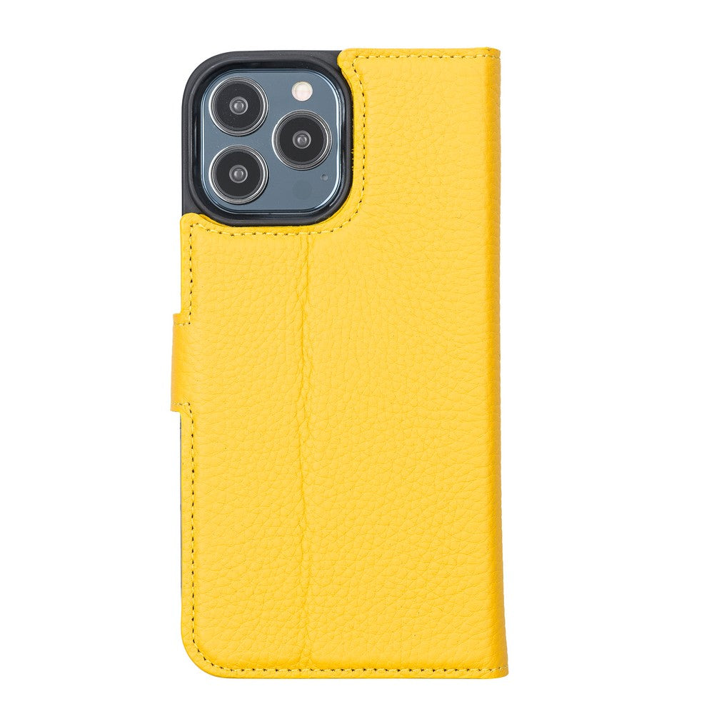 Apple iPhone 13 Pro Max uyumlu, Hakiki Deri, El Yapımı, Cüzdanlı Kılıf, Limon Sarı