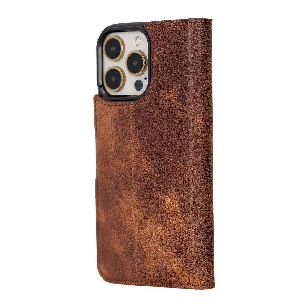 Apple iPhone 13 Pro Max uyumlu, Hakiki Deri, El Yapımı, Cüzdanlı Kılıf, Antik Koyu Kahve