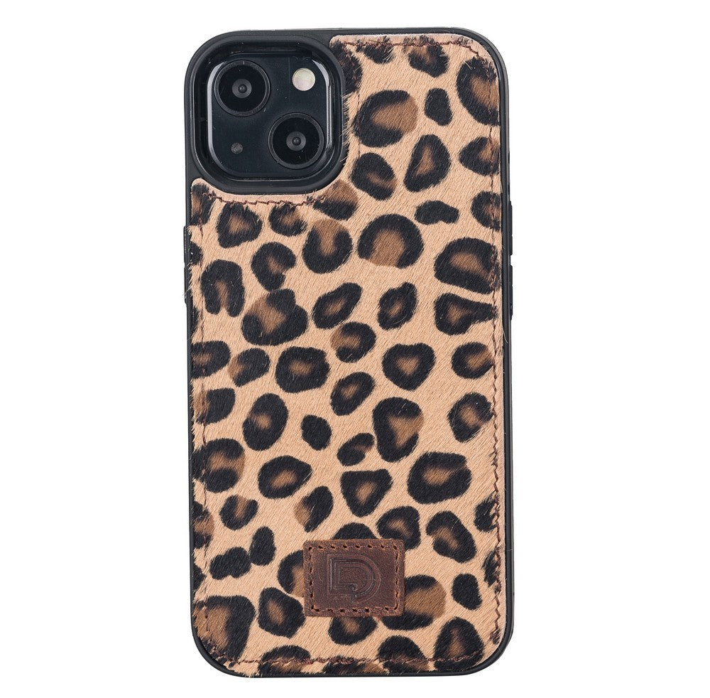Apple iPhone 13 Uyumlu Hakiki Deri, El Yapımı, Cüzdanlı Kılıf, Leopar Desen