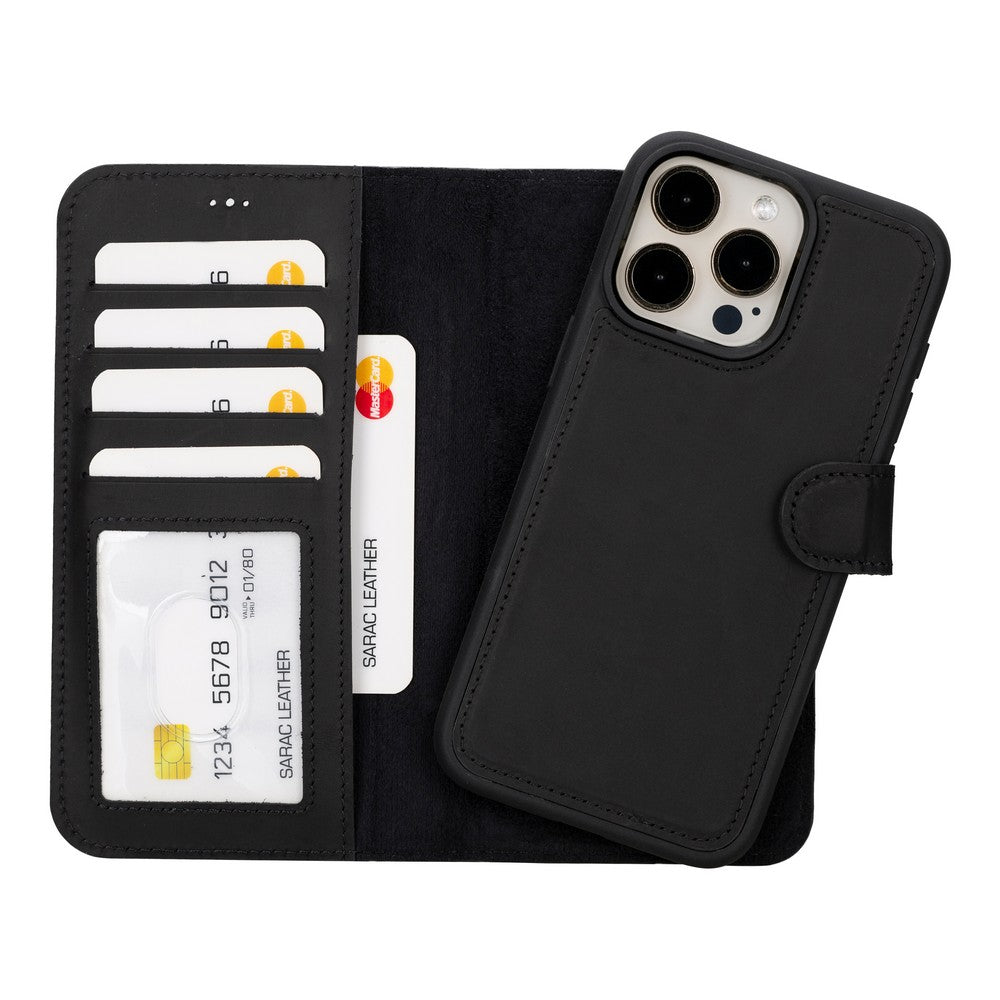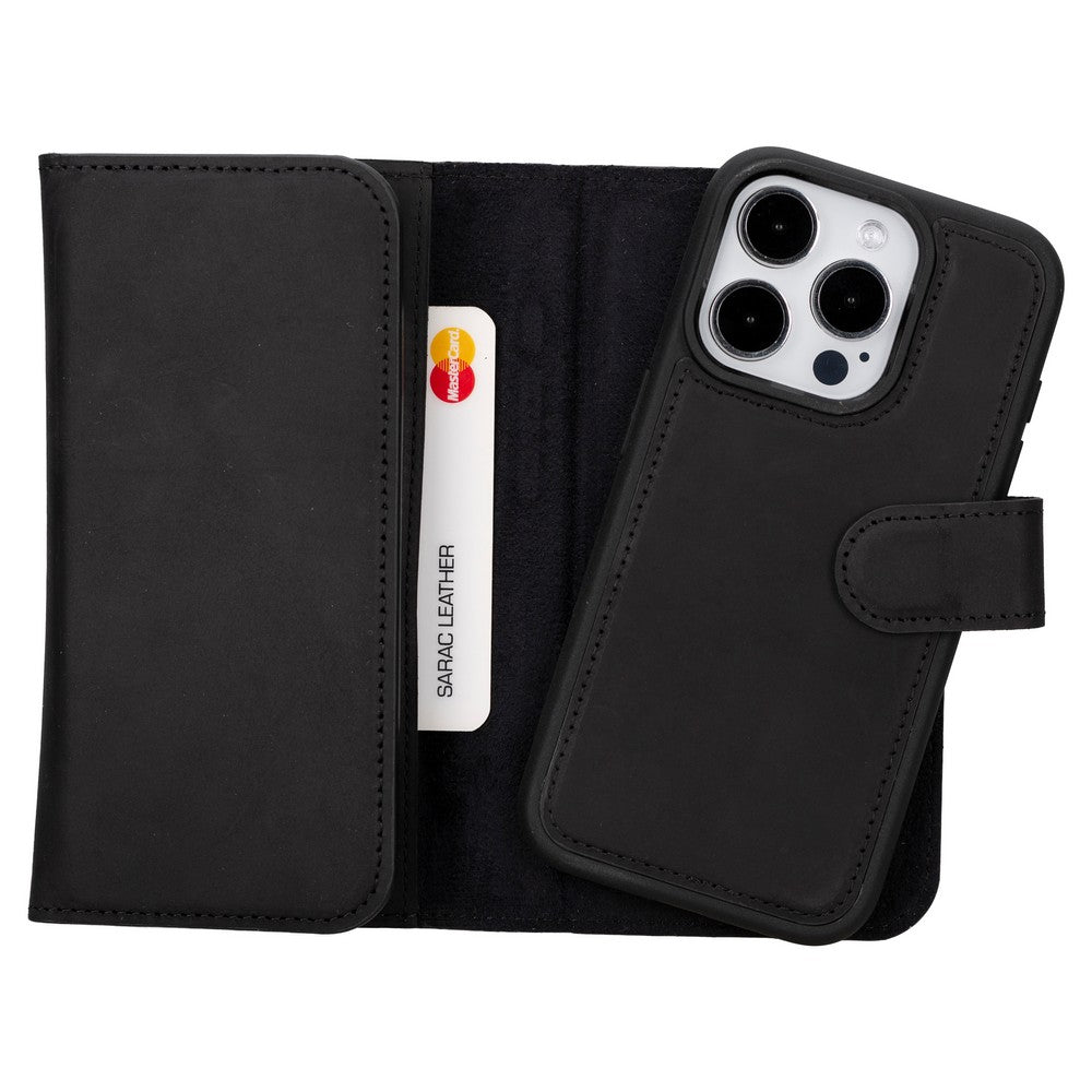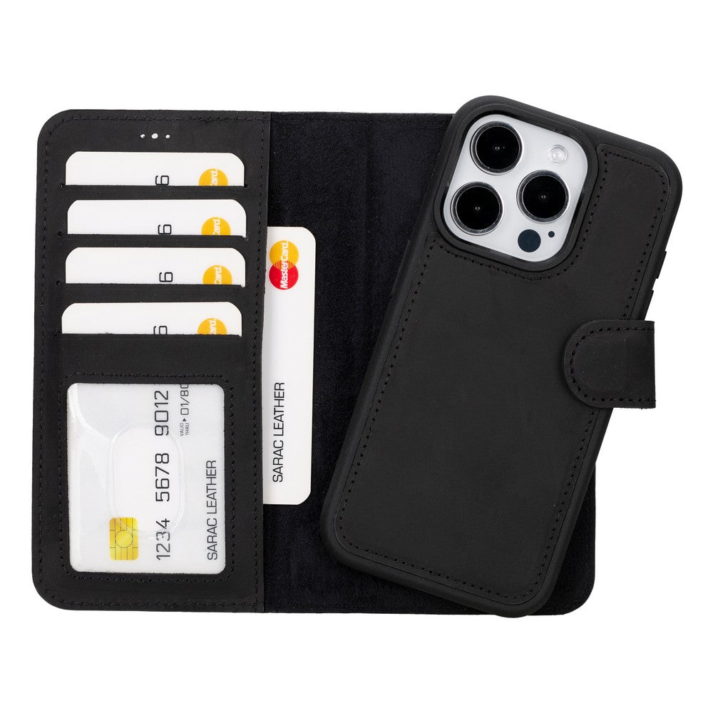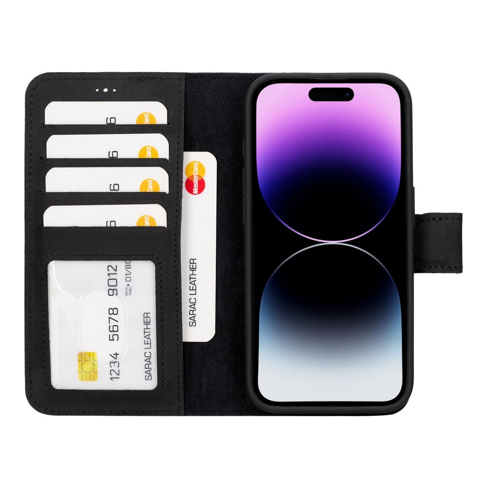 Apple iPhone 15 Pro uyumlu, Hakiki Deri, El Yapımı, Cüzdanlı Kılıf, Rustik Siyah