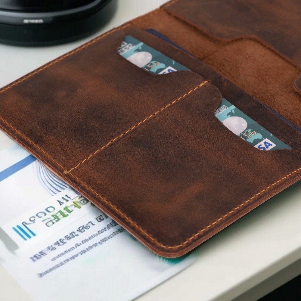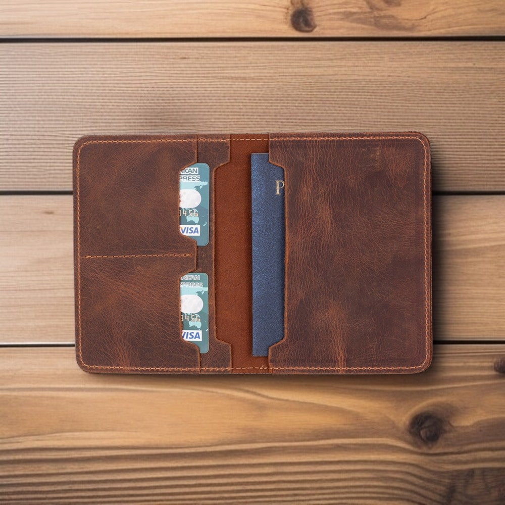 Hakiki Deri, El Yapımı, Cüzdanlı Pasaport Kılıfı, 4 Adet Kart Bölmesi, Acı Kahve