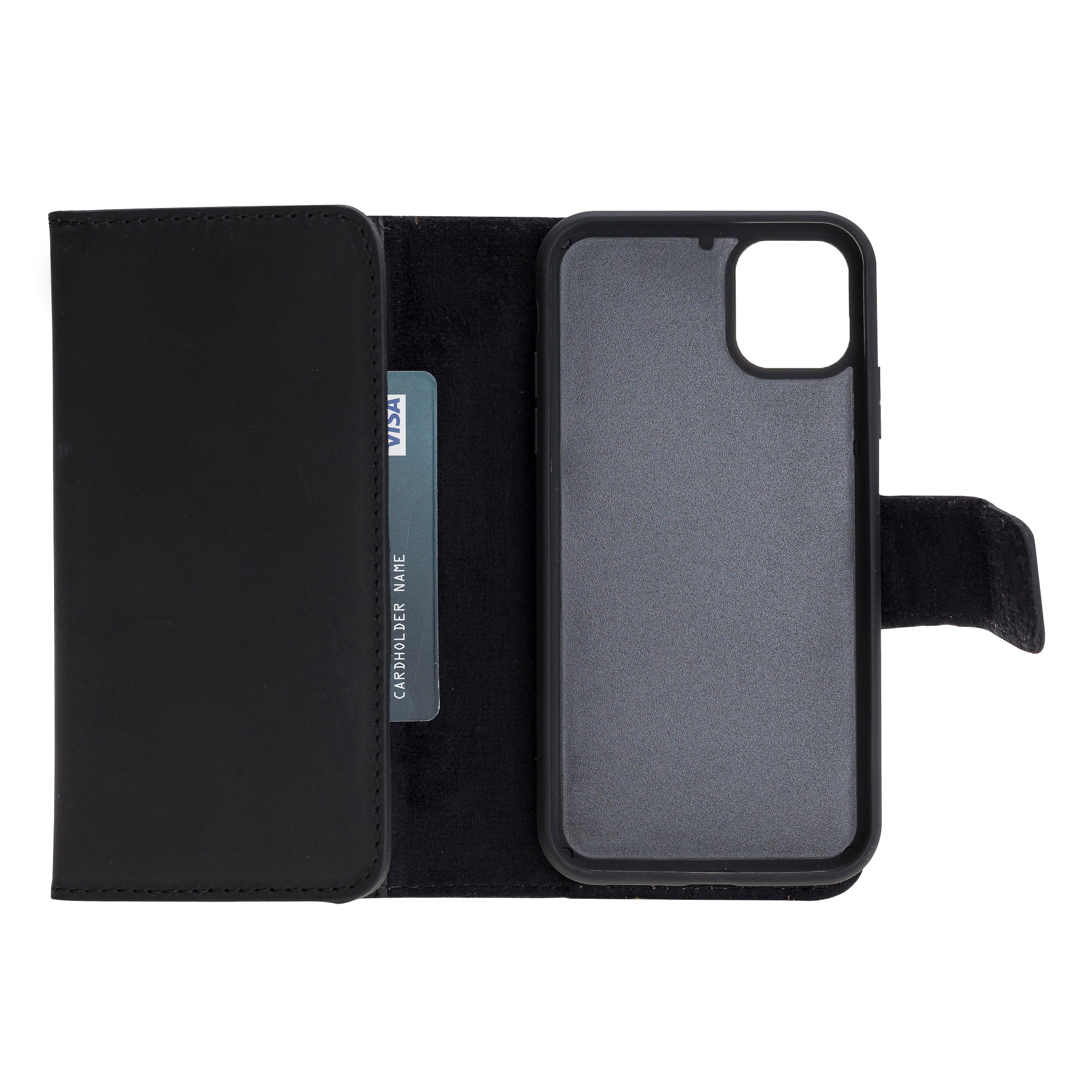 Apple iPhone 11 Pro Max uyumlu, Hakiki Deri, El Yapımı, Cüzdanlı Kılıf, Siyah