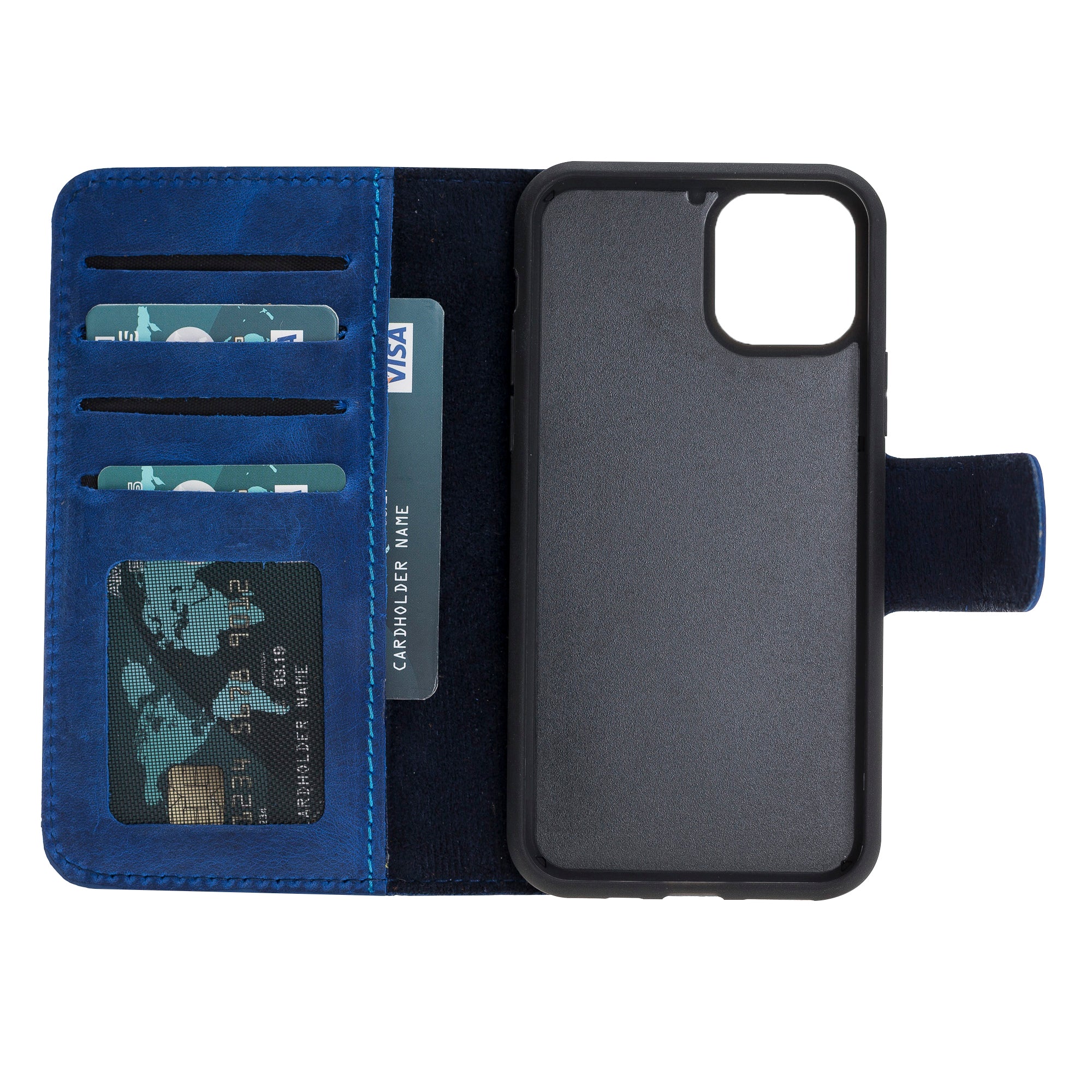 Apple iPhone 11 Pro uyumlu, Hakiki Deri, El Yapımı, Cüzdanlı Kılıf, Mavi