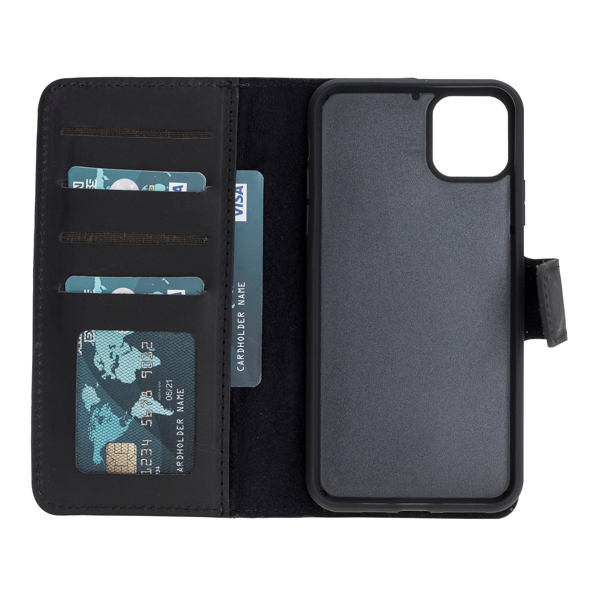 Apple iPhone 11 uyumlu, Hakiki Deri, El Yapımı, Cüzdanlı Kılıf, G1 Siyah