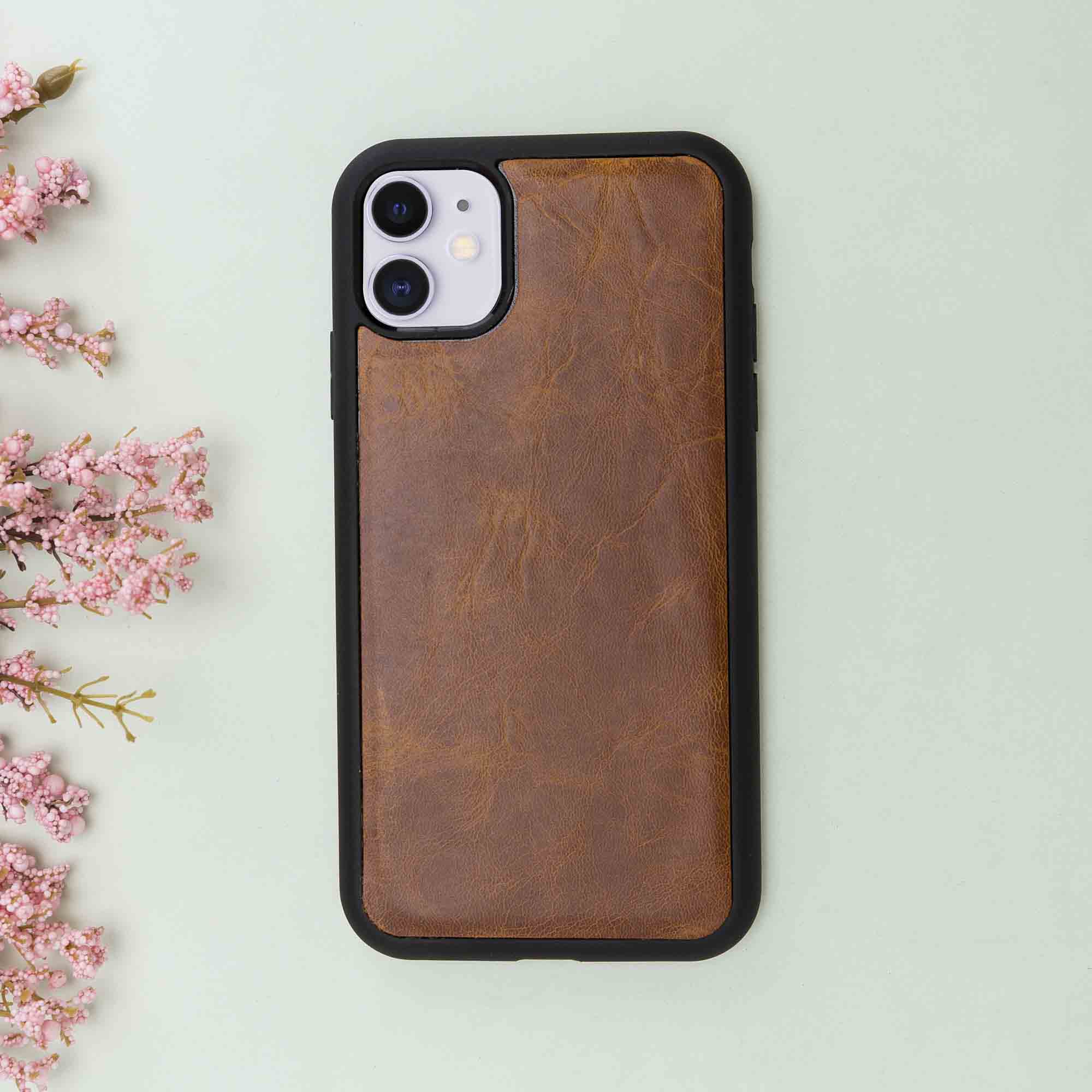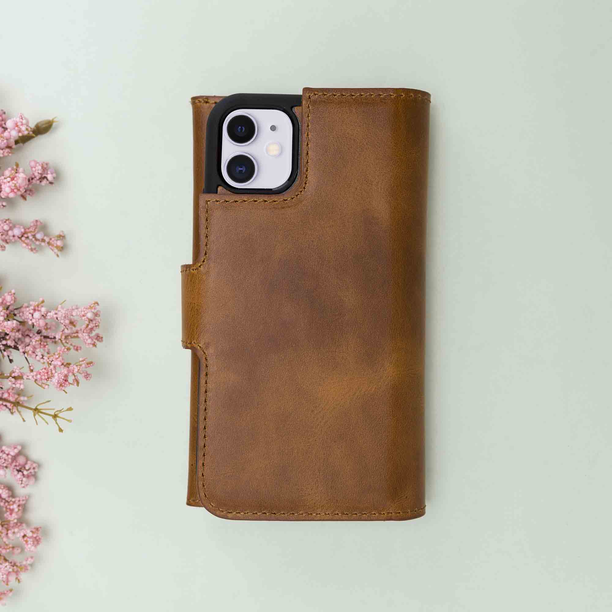 Apple iPhone 11 uyumlu, Hakiki Deri, El Yapımı, Cüzdanlı Kılıf, Taba