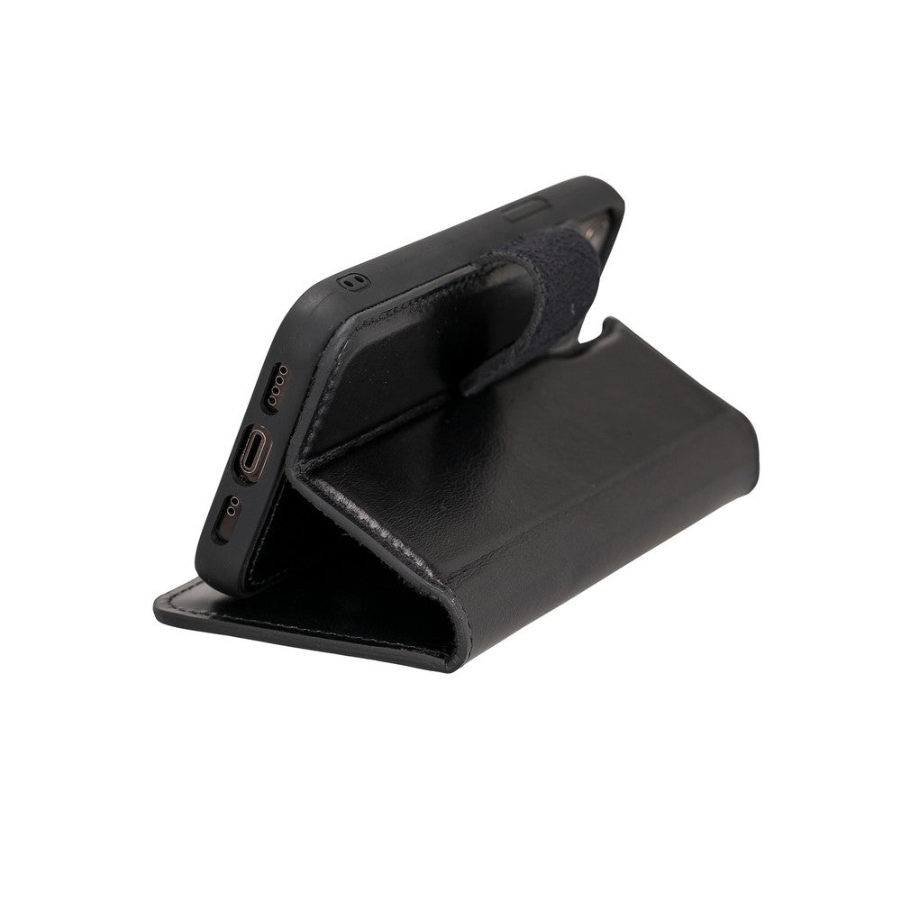 Apple iPhone 12 mini uyumlu, Hakiki Deri, El Yapımı, Cüzdanlı Kılıf, Rustik Siyah