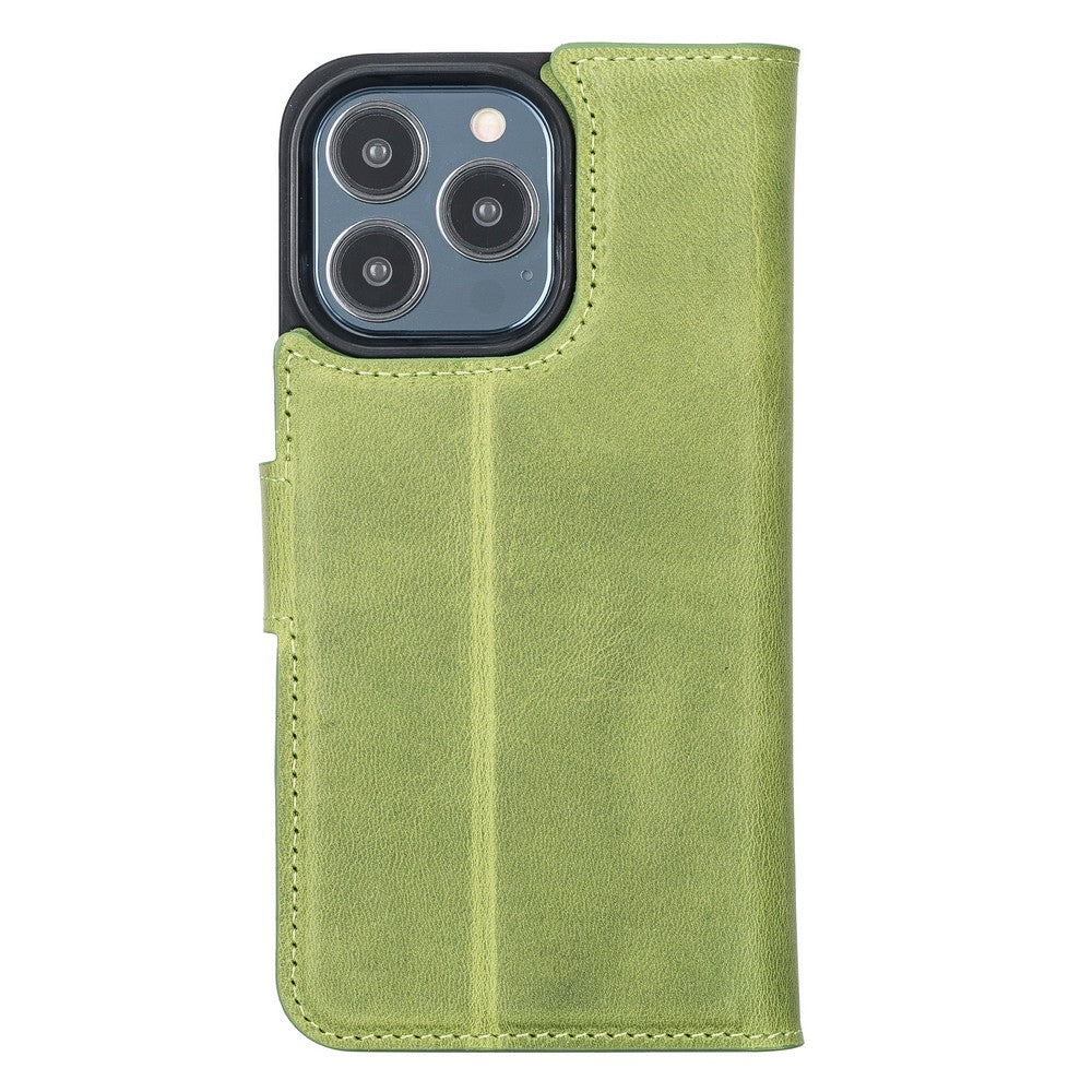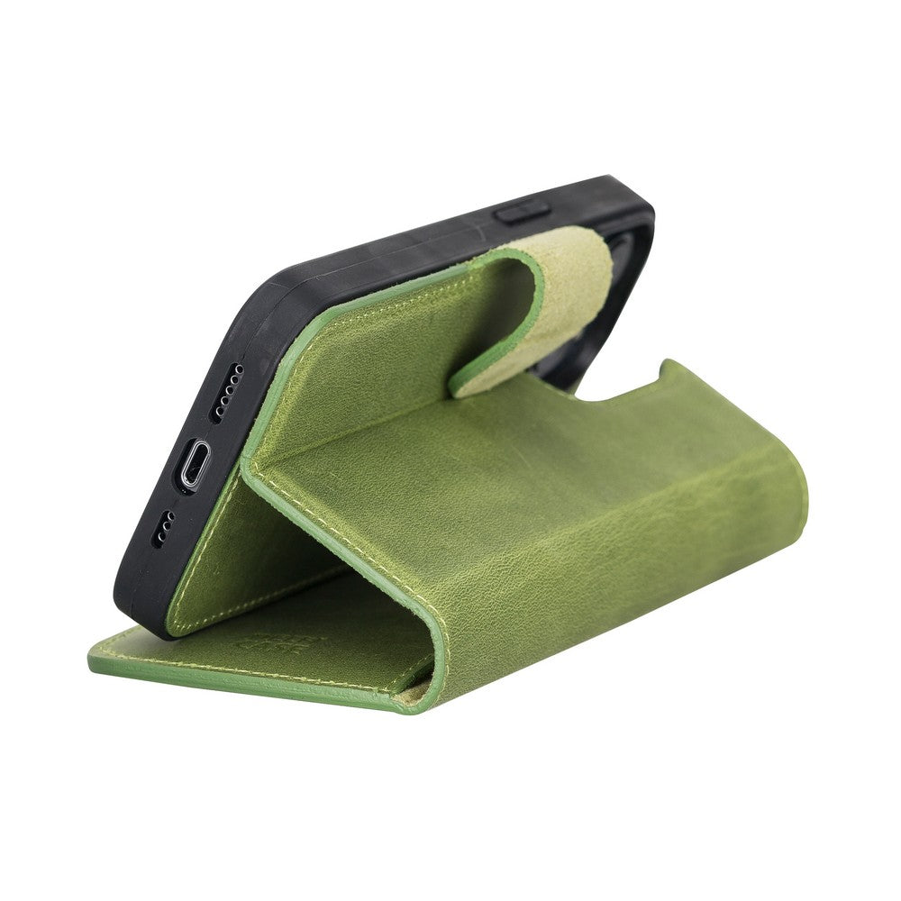 Apple iPhone 13 Pro uyumlu, Hakiki Deri, El Yapımı, Cüzdanlı Kılıf, Antik yeşil