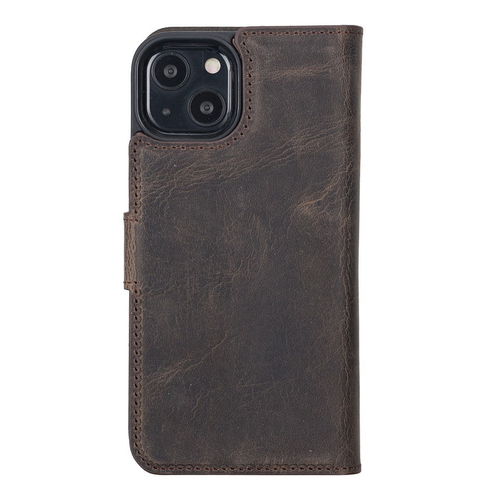 Apple iPhone 13 uyumlu, Hakiki Deri, El Yapımı, Cüzdanlı Kılıf, Acı Kahve
