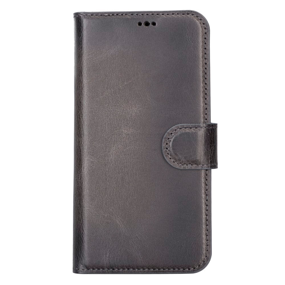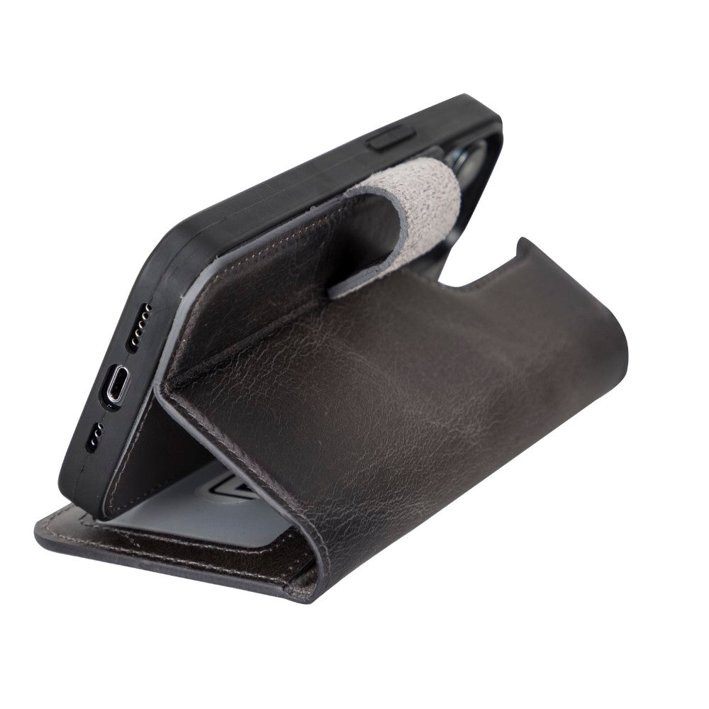 Apple iPhone 13 Pro uyumlu, Hakiki Deri, El Yapımı, Cüzdanlı Kılıf, TN1 Gri
