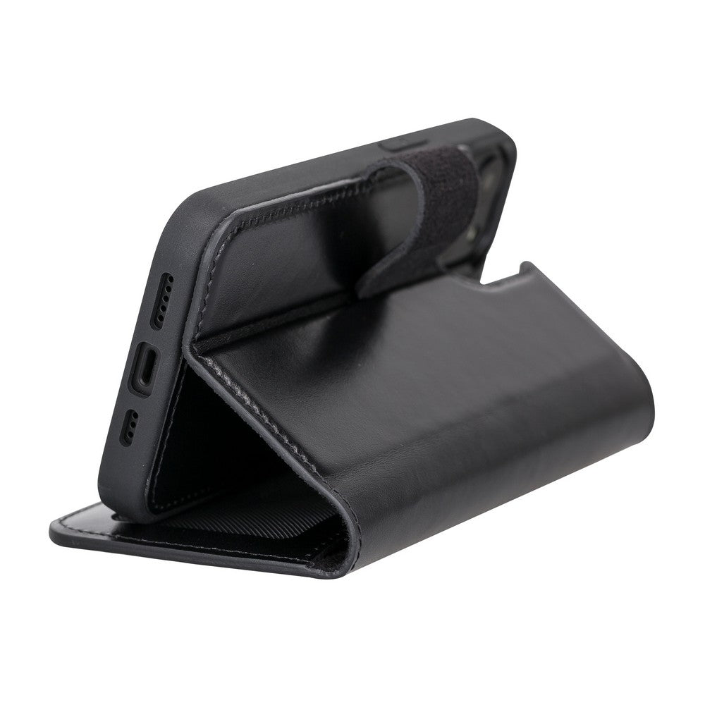 Apple iPhone 13 uyumlu, Hakiki Deri, El Yapımı, Cüzdanlı Kılıf, Rustik Siyah