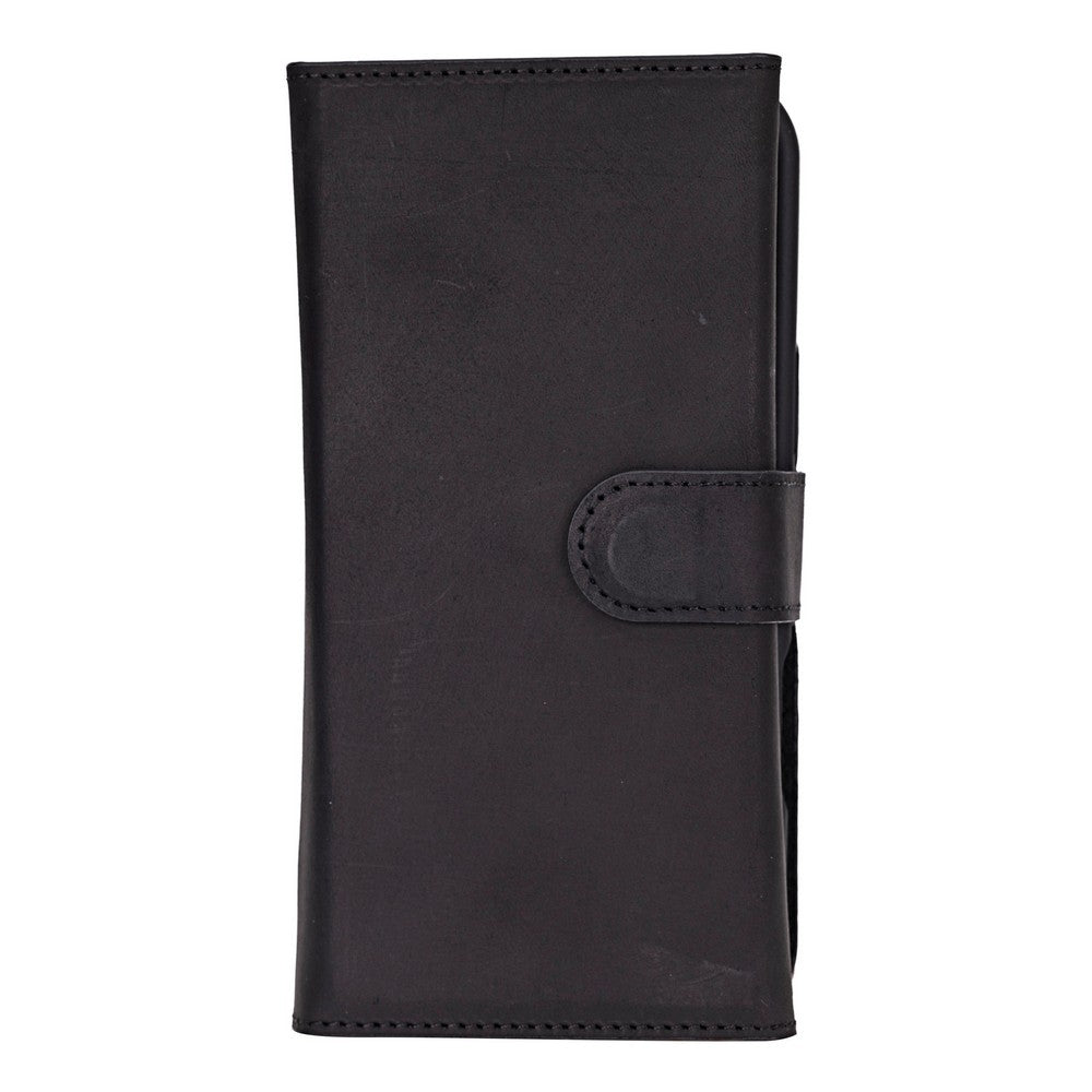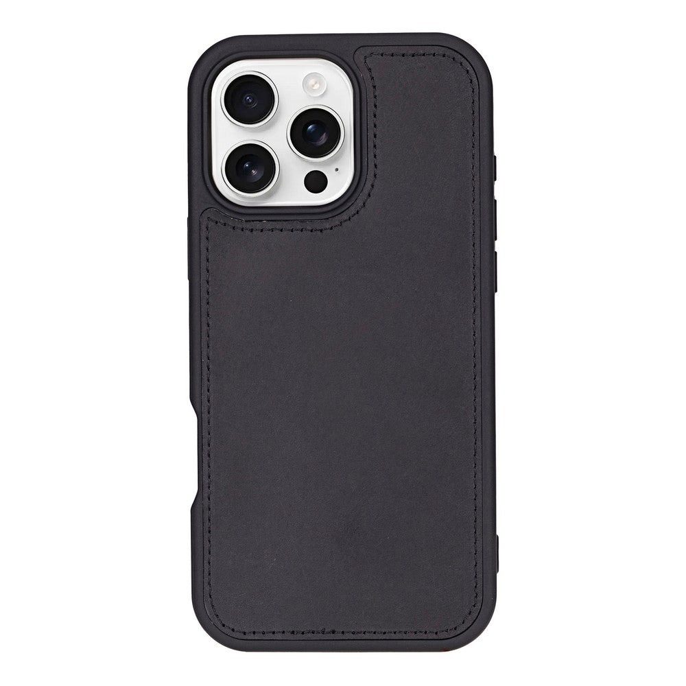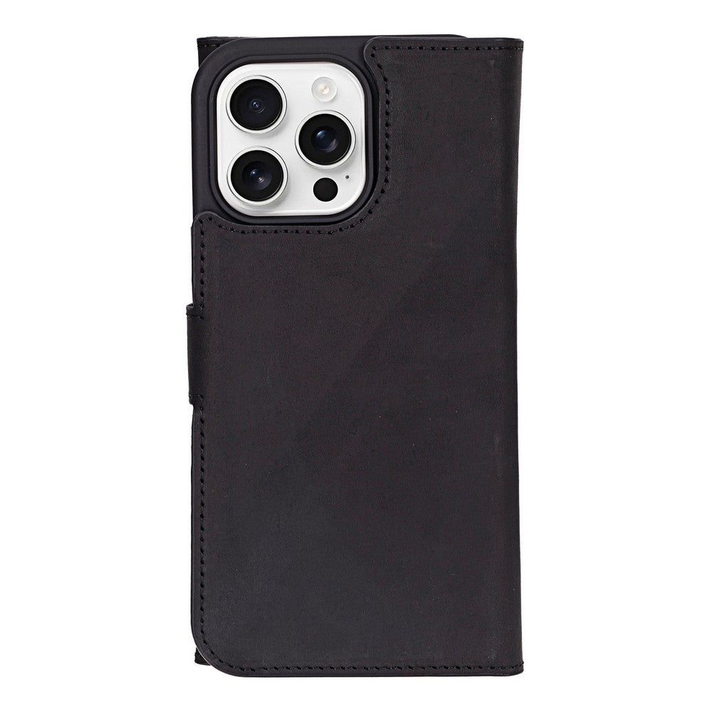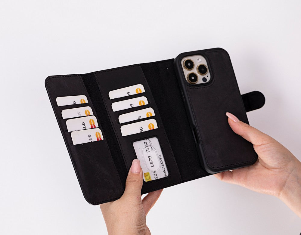 Apple iPhone 16 Pro Max uyumlu, Hakiki Deri, El Yapımı, Cüzdanlı Kılıf, Mat Siyah
