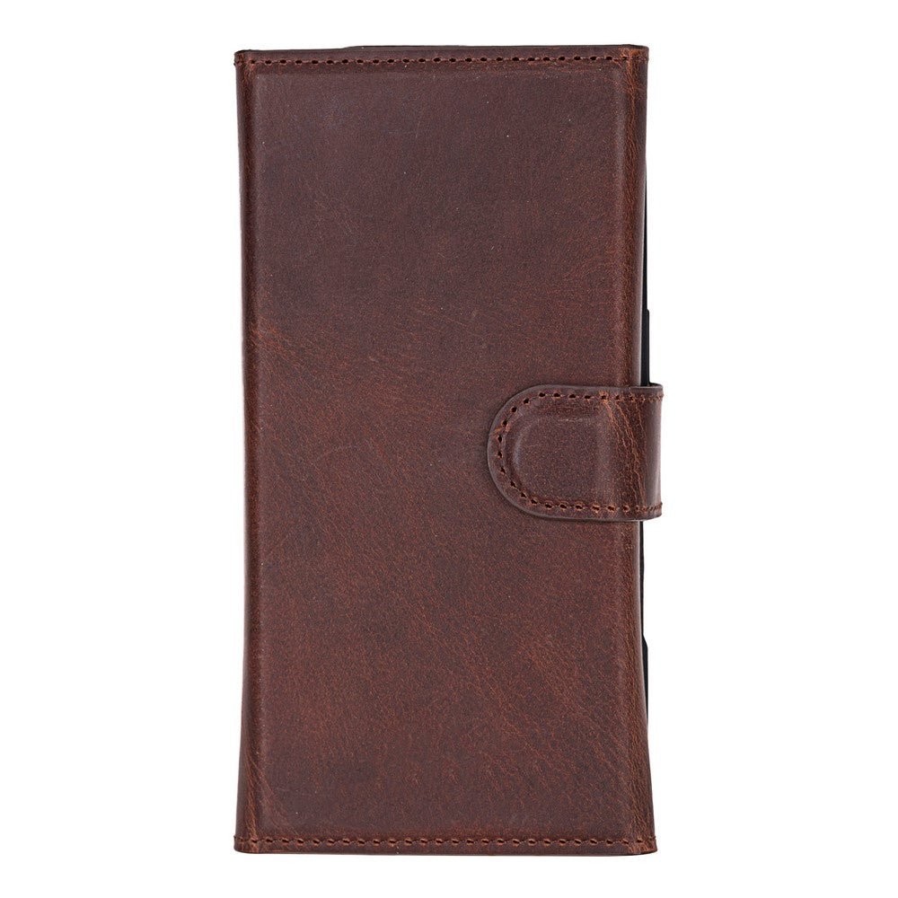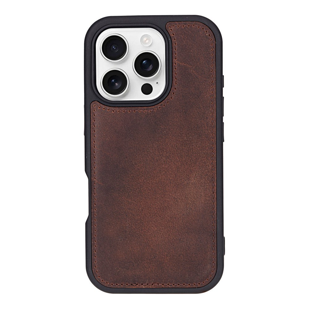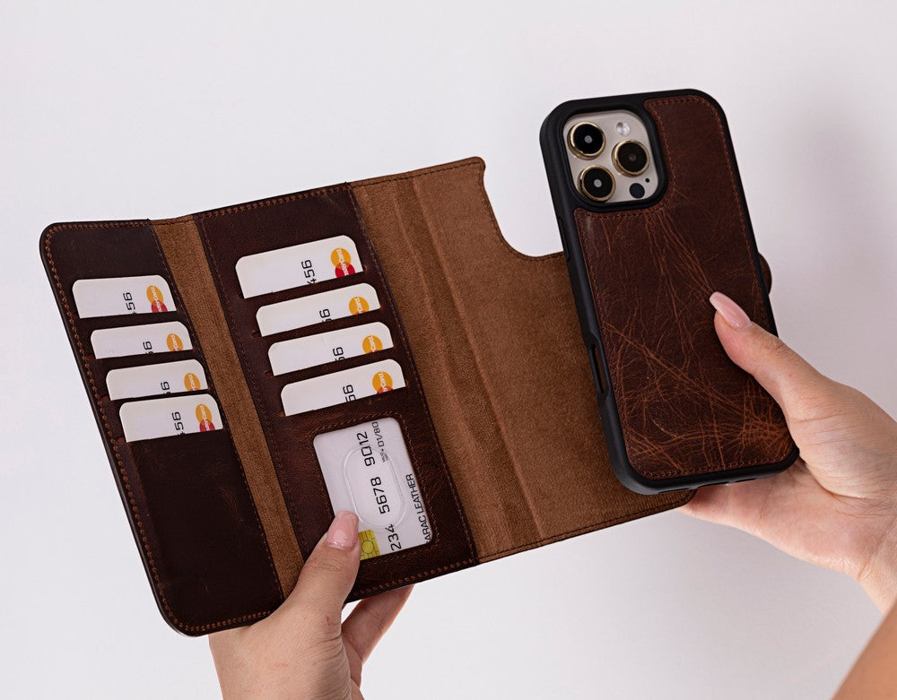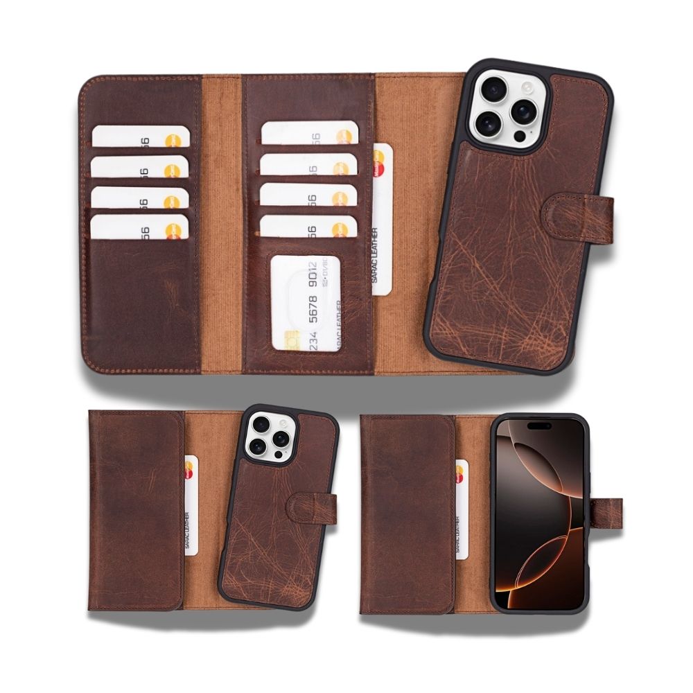 Apple iPhone 16 Pro uyumlu, Hakiki Deri, El Yapımı, Cüzdanlı Kılıf, Antik Kahve
