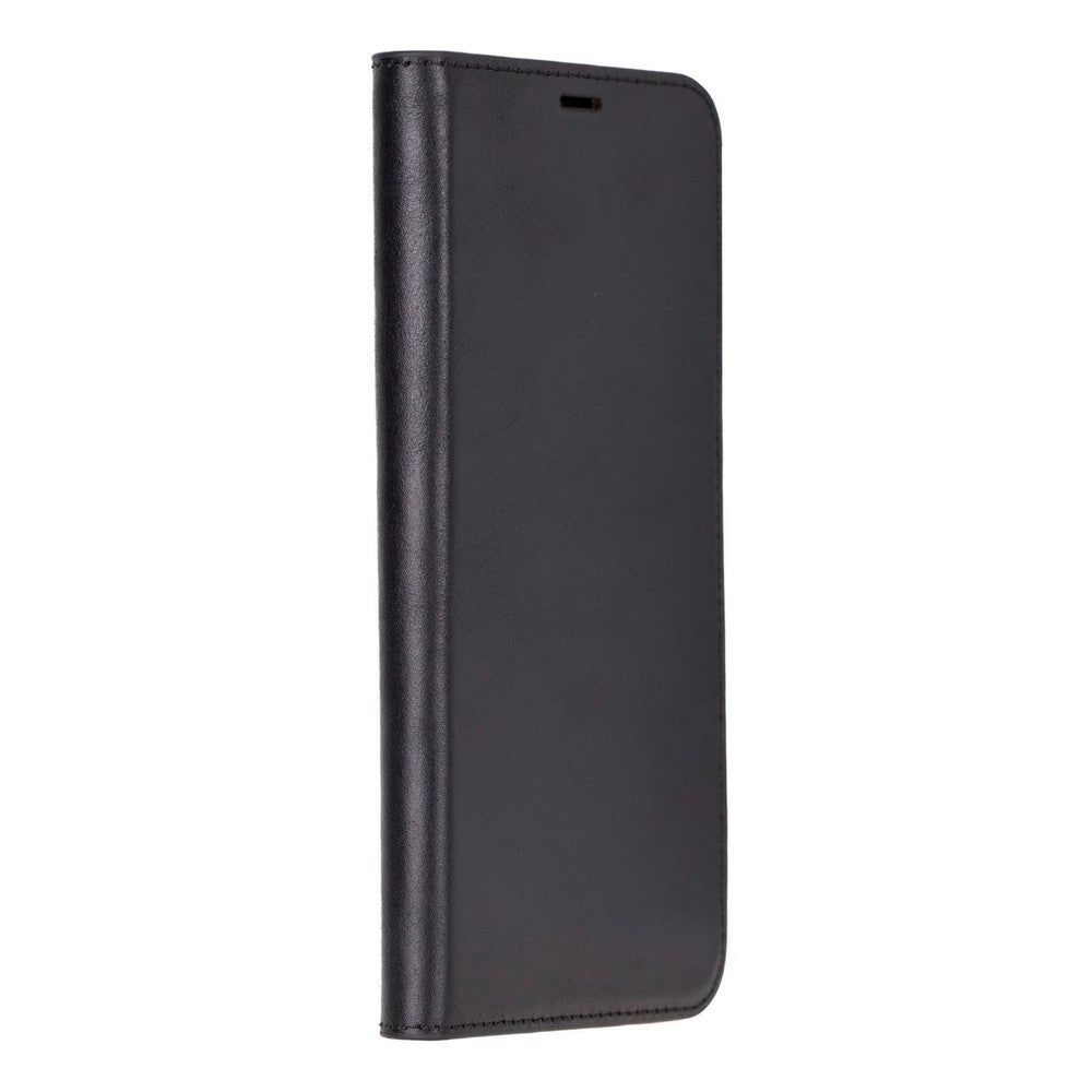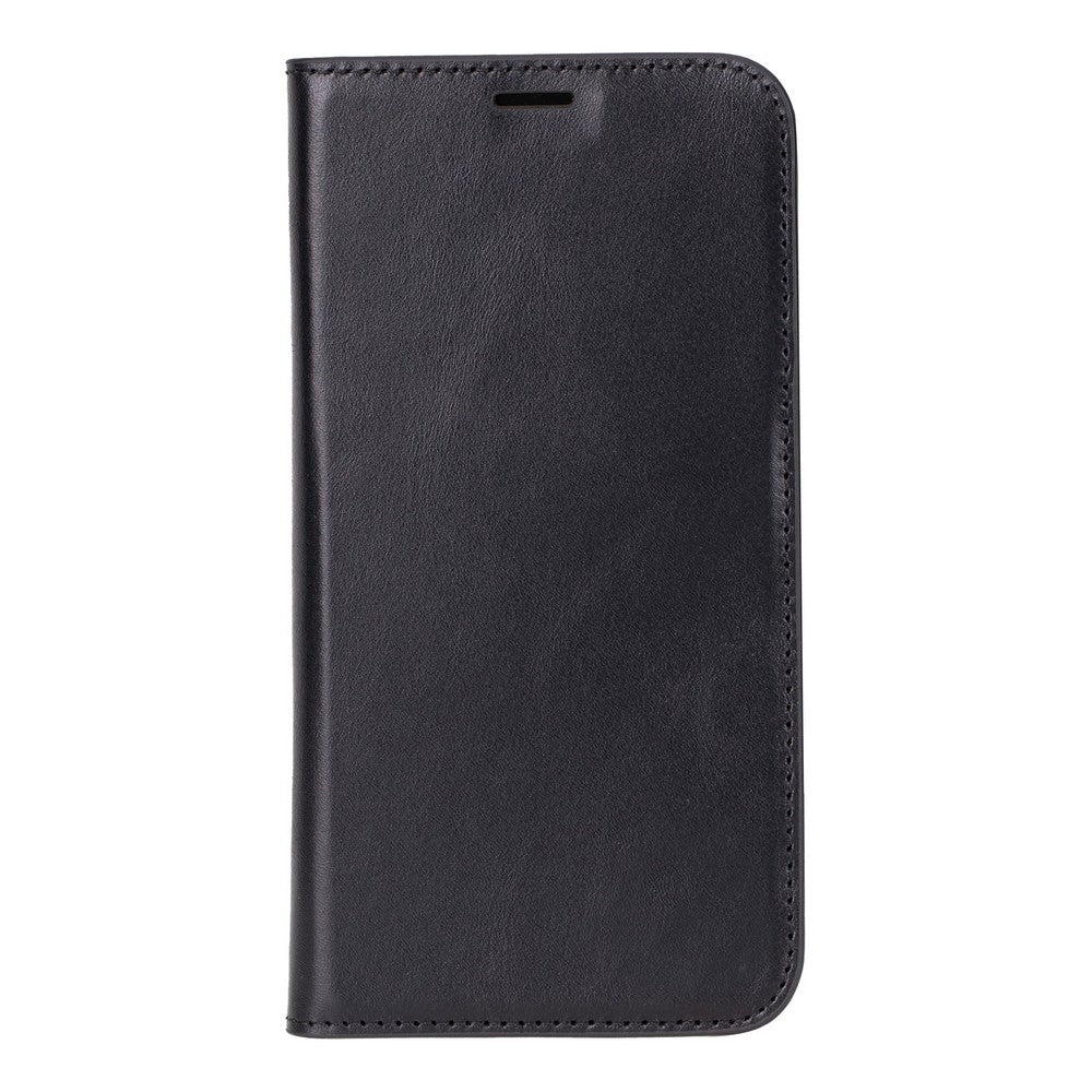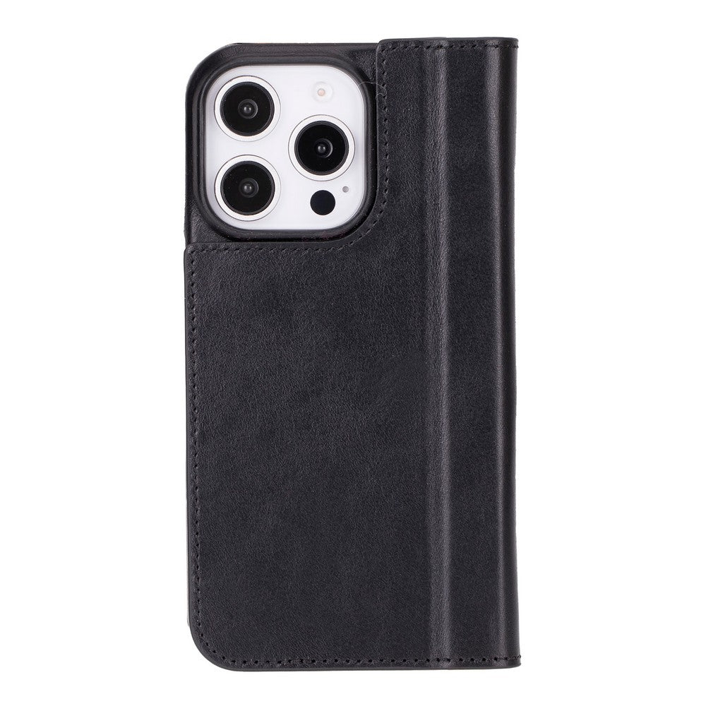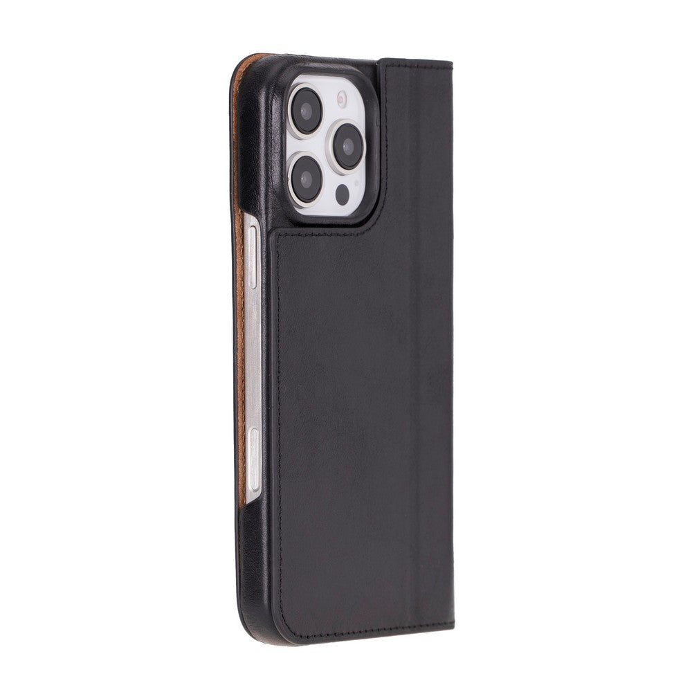 Apple iPhone 16 Pro uyumlu, Hakiki Deri, El Yapımı, Cüzdanlı Kılıf, Parlak Siyah