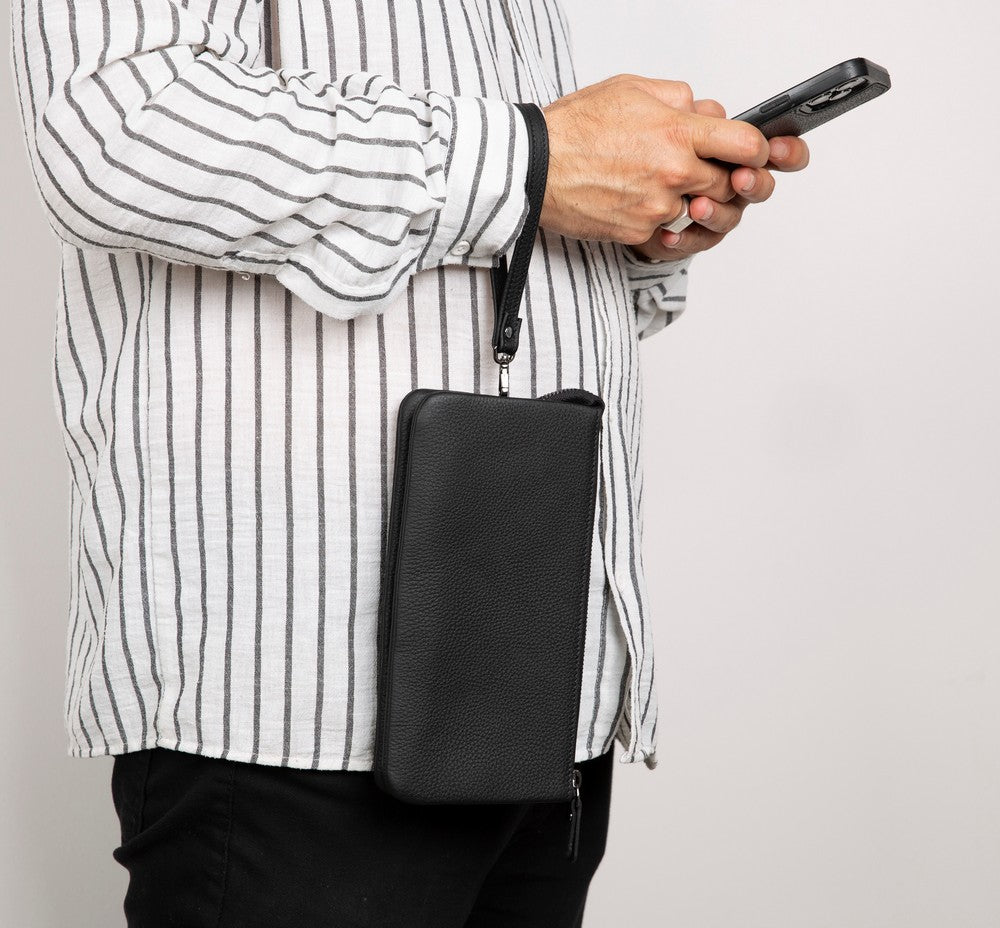 Bu deri çanta, hareket halindeyken şık bir saklama çözümüne ihtiyaç duyan herkes için idealdir. Geniş ana fermuarlı bölmesi, içerisinde birden fazla iç cep ve küçük eşyalar için ikinci bir fermuarlı bölme barındırır. Kullanım kolaylığı ve konfor göz önünde bulundurularak tasarlanan çanta, bilek askısı ve elcik ile pratik taşıma imkânı sunar.